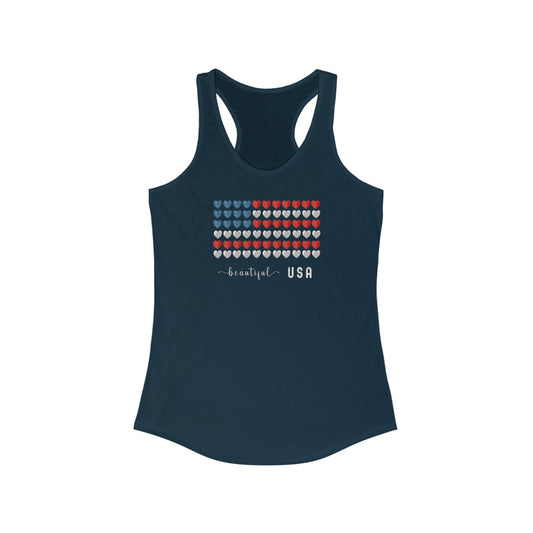 USA Flag Women's Racerback Tank Top, Heart Pattern, Vintage Colors, Beautiful USA Text, Medium Design