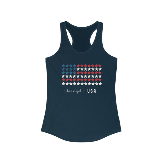 USA Flag Women's Racerback Tank Top, Star Pattern, Vintage Colors, Beautiful USA Text, Medium Design